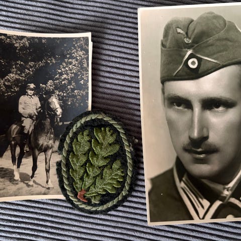 Diverse militærutstyr bestående av bærereimer og vesker i lær og stoff. Produktene inkluderer flere typer bærereimer med lommer i grønn stoff, samt lærvesker og en stor lærveske med kryssremmer. Materialene er hovedsakelig lær og stoff i ulike nyanser av grønt og brunt.