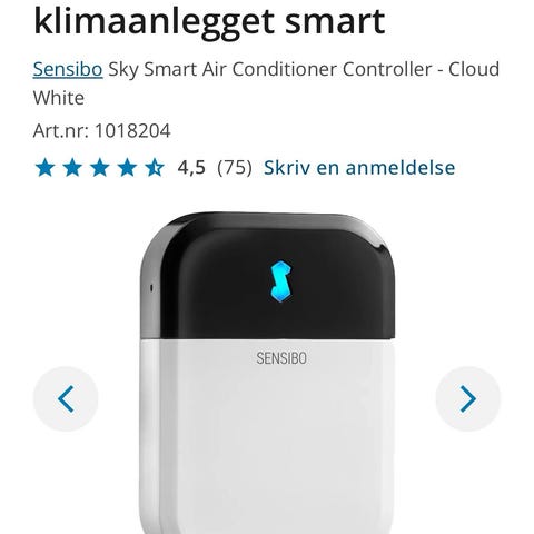 Sensibo Air Rom Sensor i hvit farge. En enhet designet for å gjøre luftkondisjonering eller varmepumpe smart ved fjernstyring. Inkluderer sensor, lader og monteringsutstyr. Passer til bruk med fjernkontrollstyrte klimaanlegg og varmepumper.