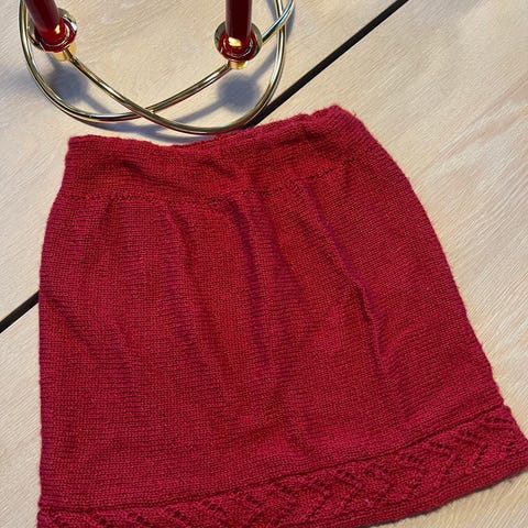 Hjemmestrikket ullskjørt. Lite brukt. Lengde 31 cm, bredde 31 cm. Strikk i livet så passer mange str. Datteren vår brukte fra hun var 4-6 år