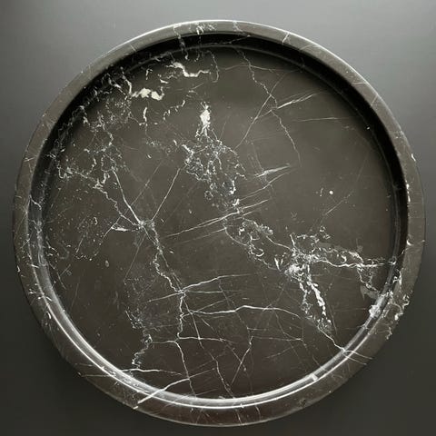 H&M Home rund dekorasjonsplate med svart marmorert mønster. Passer til dekorasjon eller som underlag for andre gjenstander. Materialet og størrelse er ikke oppgitt.