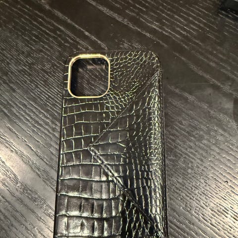 Apple telefondeksel med brunt mønster. Dekselet har en kombinasjon av materialer med et mønstret design på baksiden. Det er laget for å beskytte telefonen og gir tilgang til alle nødvendige knapper og porter.