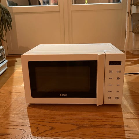 Logik mikrobølgeovn i hvit farge. En kjøkkenapparat for oppvarming og tilberedning av mat ved bruk av mikrobølger.