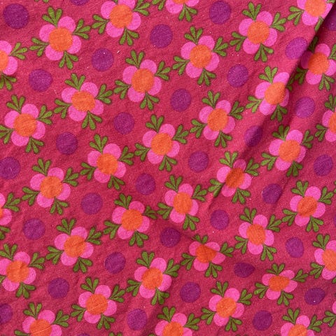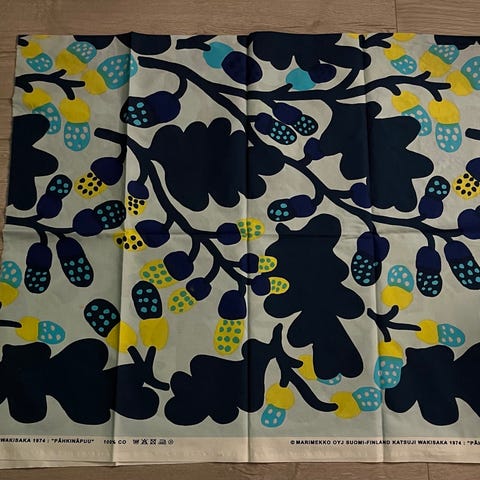 Marimekko bomullsstoff med mønster av blader og bær i røde og grønne toner. Stoffet er sydd som duk men er ikke brukt. Størrelse 145x149 cm. Stoffet passer med gardinstoff Morelli, samme farger, av samme designer, se egen annonse