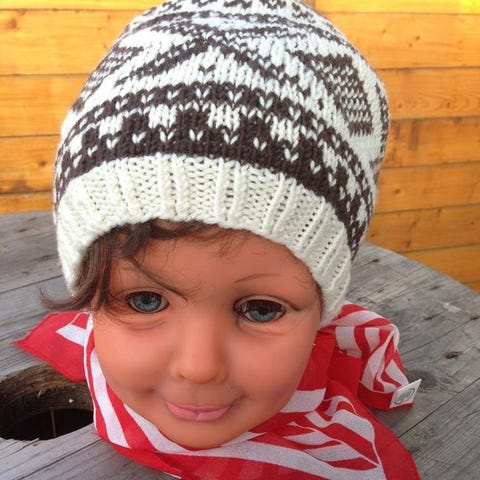 Strikkelue i Marius mønster.