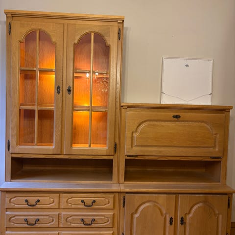 Vitrinaskap eik med hyller og skuffer. 630mm x 420mm x 1880mm