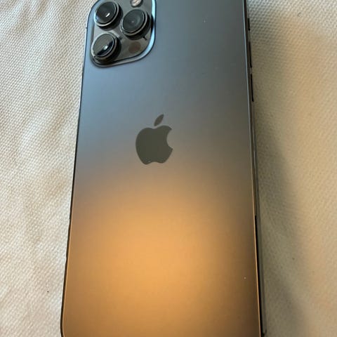 Apple iPhone 12 Pro Max mobiltelefon med 128 GB lagringskapasitet. Enheten har skjerm i god stand, flere kameraer på baksiden, og kjører iOS 26.2 Batterikapasiteten er på 100 %, og optimalisert batterilading er aktivert.
