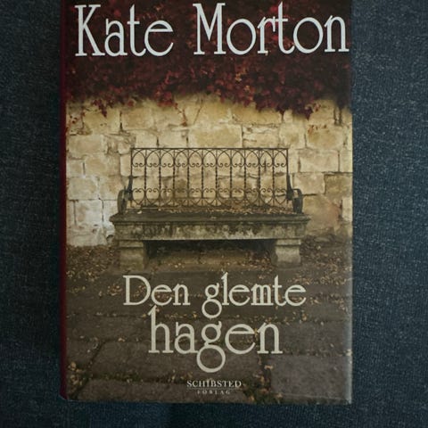Kate Morton Den glemte hagen er en roman. Boken har et omslag med en benk foran en steinvegg. Den tilhører skjønnlitteratur og er skrevet på norsk.