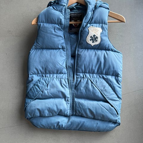 Kingsland Collection vattert vest til barn i størrelse L, som tilsvarer 8-10år. Vesten har fargene rød, hvit og svart i brede striper. Materialet består av 70% dun og 30% fjær i fyll, samt 100% polyester i ytterstoffet. Designet er uten ermer og har glidelås foran.