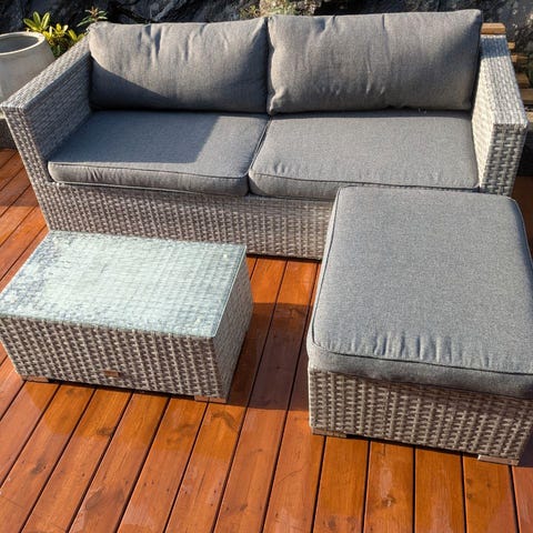Flott sofa i tre til hage eller terrasse. Har stått ute hele året. Putene har en del merker, men det er mye sofa igjen. Kjøpt på Jysk for en del år siden. Må hentes.