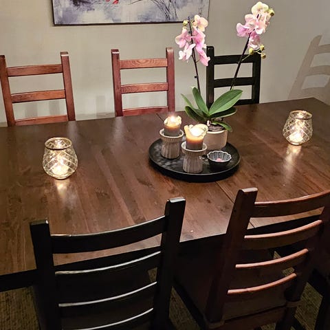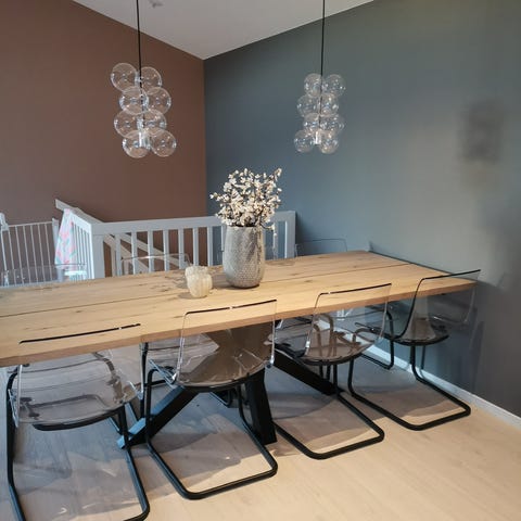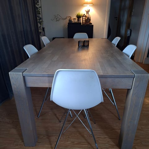Spisebord med 3 ileggsplater og 8 spisestoler