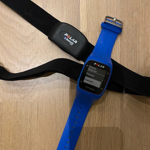 Polar M400 pulsklokke der pulsbelte også følger med. Den er en god del år gammel, men er svært lite brukt. Pulsbeltet er brukt bare noen få ganger. Klokken har noen striper på skjermen, ellers fungerer den som den skal.