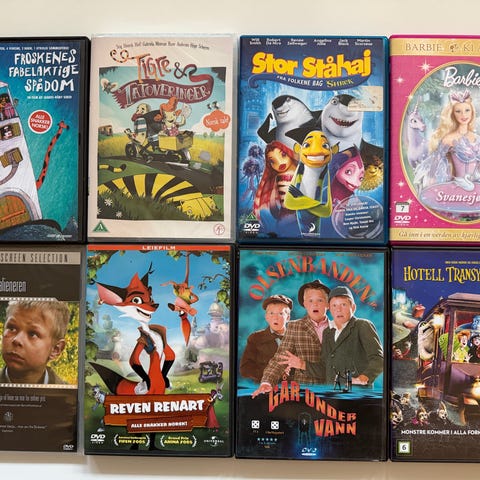 Samling av barnefilmer på DVD med ulike titler og sjangere. Filmene inkluderer animasjon og eventyr, egnet for barn. Format: DVD.