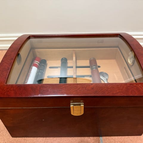 Pent sigar/sigarettskrin i tinn (Perletinn) fra 50/60 tallet, kledd med treverk inni, selges for 250 kroner.