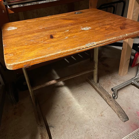 Den har rom under skriveplaten og stolen eller benken er integrert.