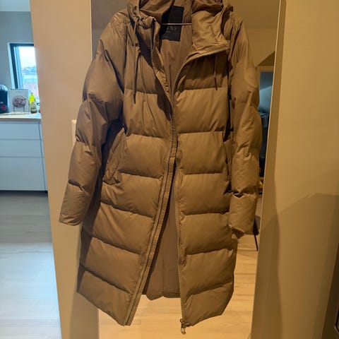 Varm vind- og vanntett dunkåpe fra UBR. Nydelig farge som ikke kommer helt frem på bildene. Jeg vil si den er grønn-beige. Brukt 2-3 ganger. Selges da den dessverre blir for varm for meg. Kvittering kan medfølge.