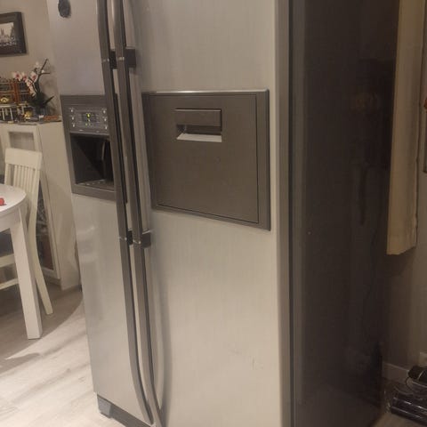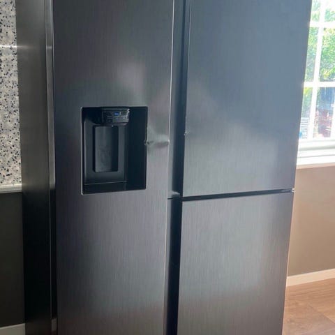 Samsung Side-by-Side kjøleskap med to dører, rustfritt stål utførelse. Kjøleskapet har flere hyller og dørrom for oppbevaring, samt integrert vann- og isdispenser. Passer til bruk i kjøkken for oppbevaring av mat og drikke.