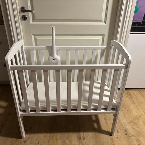 Liten kosmetisk «skade». Kan følge med madrass (dreamzone baby) og laken til madrass.