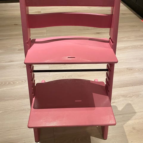 Klassikeren Stokke Høy barnestol laget i tre. Stolen har justerbare seter og fotstøtte, designet for barn. Passer til bruk ved bord og gir støtte for barn i vekst.
