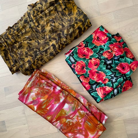 Stoffer som kan brukes til kjoler eller bluser. Disse er kjøpt i midtøsten på slutten av 1960. Materialet er syntetisk. Det blå med røde blomster er litt stivt.