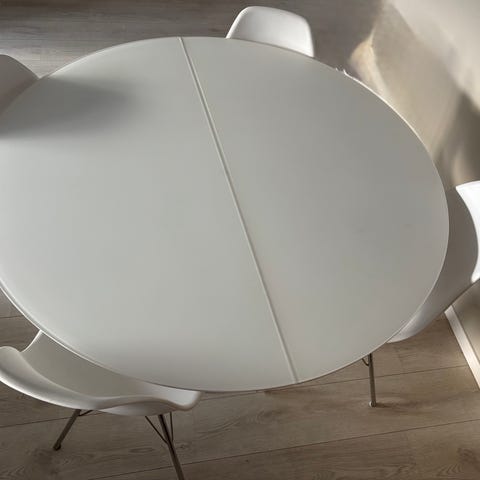 Kjempe fint spisebord fra IKEA, selges fordi vi må oppgradere til noe større da vi blir fler rundt middagsbordet👶🏼 kjøpte bordet sommer 2026 så veldig lite brukt, fler bilder kommer!