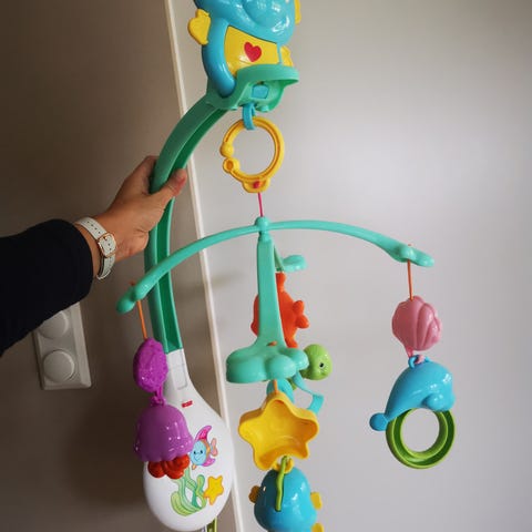 Uro fra fisher price. To forskjellige lyder - en sang og en med hjertelyd. Kan trekkes opp slik at dyrene snurrer rundt i ring.