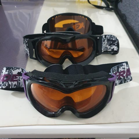 solbriller med oransje speilglass og svart ramme. Solbrillene designet for å gi beskyttelse mot sollys.