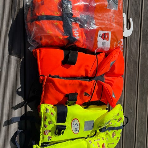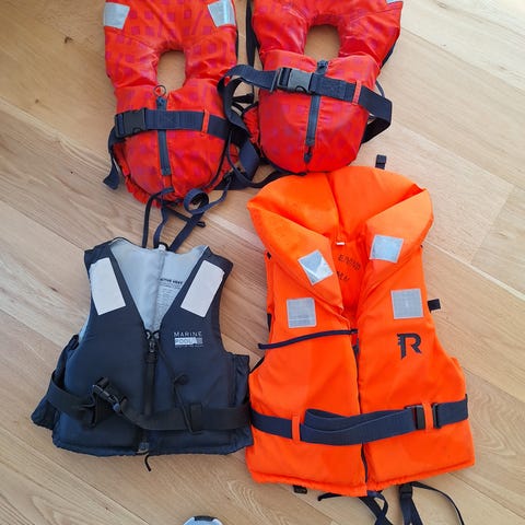 Flytevester fra 15 kg til 90 kg. Selges samlet for 200 kr eller 25 kr pr. Flytevest. Må hentes