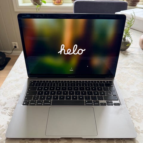 Apple macbook air M1 2020 modell. macen funker som ny, og er i god stand. den har riper som vises på bilde, å er brukt til skole.