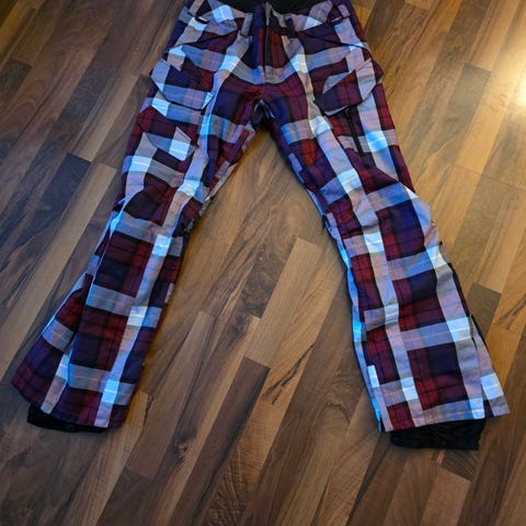 Burton bukse i størrelse L for kvinner. Flerfarget rutemønster i lilla, burgunder, lyseblå og hvit.Egnet for ulike aktiviteter innen friluft, ski og snowboard.