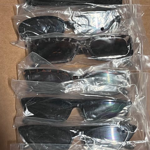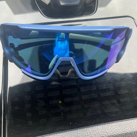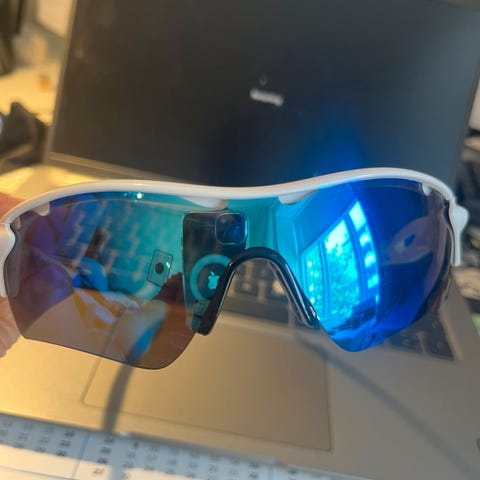 solbriller for unisex. Brillene har blåtonede speilglass og hvit og blå innfatning. Egnet for ulike utendørsaktiviteter.