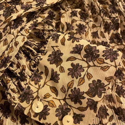 Kremfarget bluse fra midten av 1980-tallet, kjøpt i Finland. Den er i str. 40.