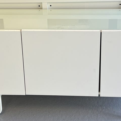 Funksjoner: Inkluderer en skyvedør og åpne hyllerom for oppbevaring.