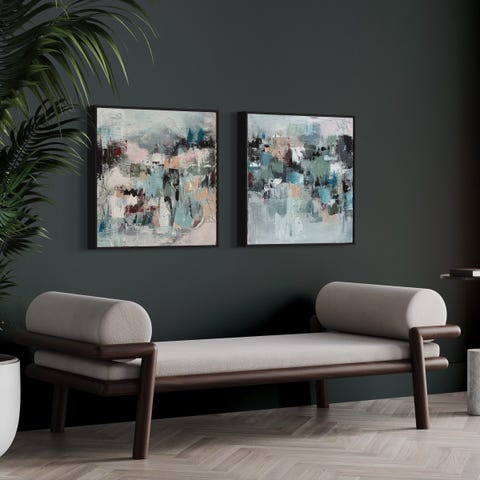 M. Holst maleri med abstrakt motiv, fargerik fremstilling av mennesker og bygninger. Maleriet har en rektangulær form og er malt på lerret. Størrelse: 103 lengde og 53 i bredde.