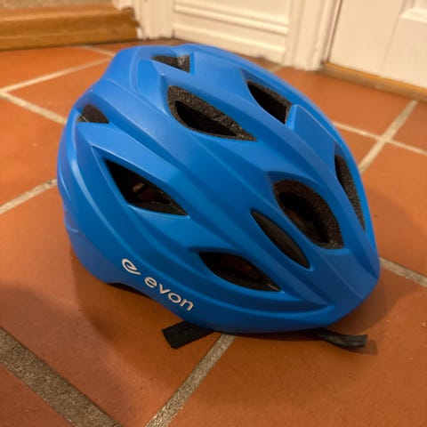 Evon sykkelhjelm i svart farge, størrelse 51-55 cm. Hjelmen er ubrukt og har justerbar passform for barn eller ungdom med hodeomkrets innenfor dette området.