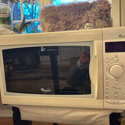 Samsung mikrobølgeovn i hvit farge. En kjøkkenapparat for oppvarming og tilberedning av mat ved hjelp av mikrobølgeteknologi. Utstyrt med kontrollpanel for ulike innstillinger.