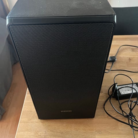 Samsung lydplanke med tilhørende subwoofer. Systemet er designet for å forbedre lydopplevelsen ved tilkobling til TV eller andre lydkilder.