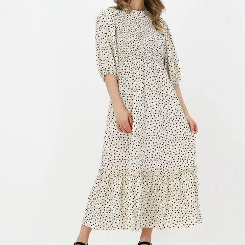 Kjolen har en beige base med rød og svart blomsterprint, kort erme og rund hals.