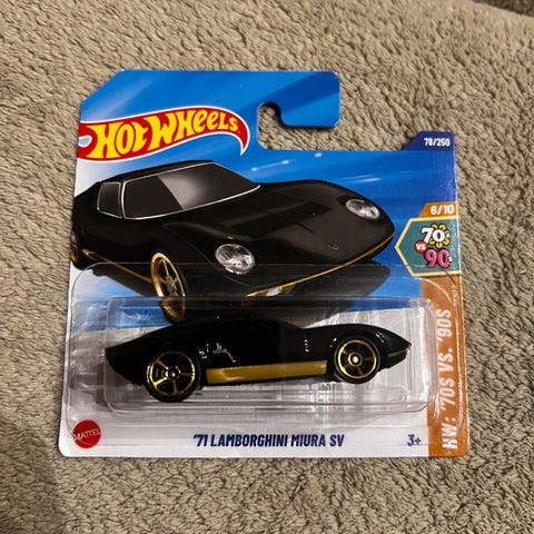 Hot Wheels '71 Lamborghini Miura SV bil i svart farge med gullfargede felger. Samleobjekt i original emballasje.