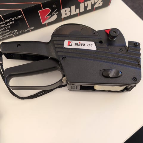 Prismaskin med ekstra fargeruller og 35 ruller med hvite prisetiketter. Mer tilbehør kan kjøpes hos Etikettsystemer, es.no