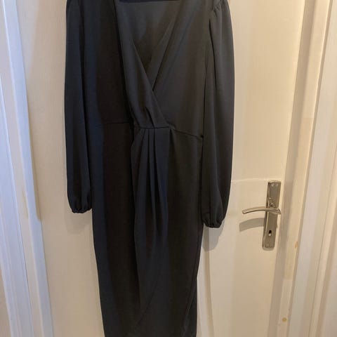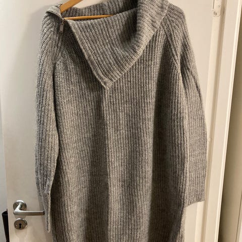 Lekker lang strikket grå kjole fra Ellos i Strl 52 med tynt knytebelte I midjen. (Kan tas av). Liten splitt nederst på begge sider av kjolen.