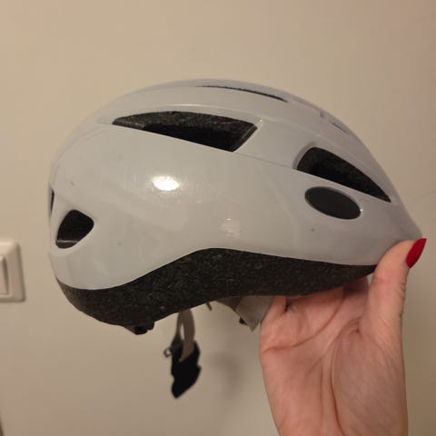 Sykkel hjelm fra 1970 tallet i svart og hvitt skinn, utstyrt med hakestropp. Størrelse 57.