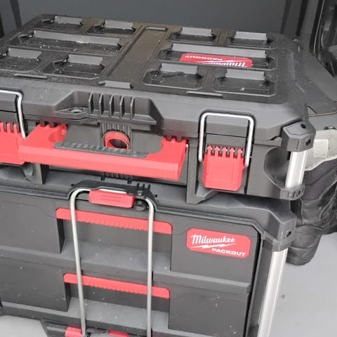 Milwaukee Packout verktøykasse med hjul og uttrekkbart håndtak. Verktøykassen har en robust konstruksjon med flere låsemekanismer og oppbevaringsrom innvendig, inkludert avtagbare skuffer for organisering av verktøy og tilbehør. Designet for enkel transport og lagring av verktøy. Selger med en koffert nr3, helt ubrukt.