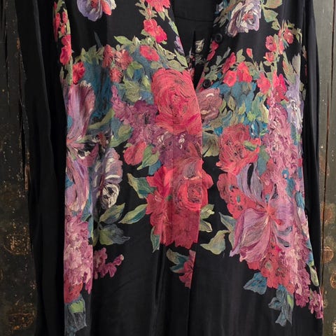 Det har en lang bluse/jakke med splitter i sidene og gullknapper nedover fronten og nede på ermene. Skjørtet er ganske langt, med to splitter bak.