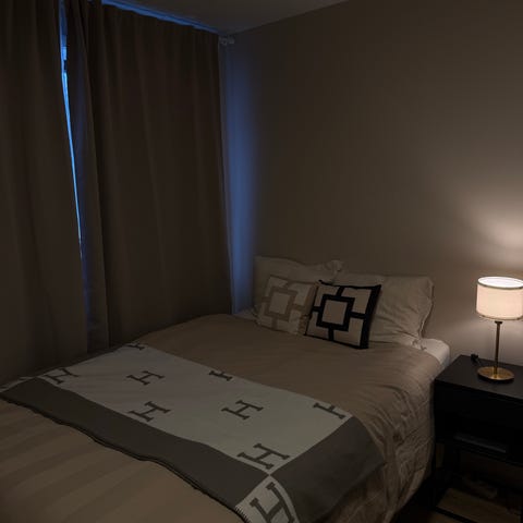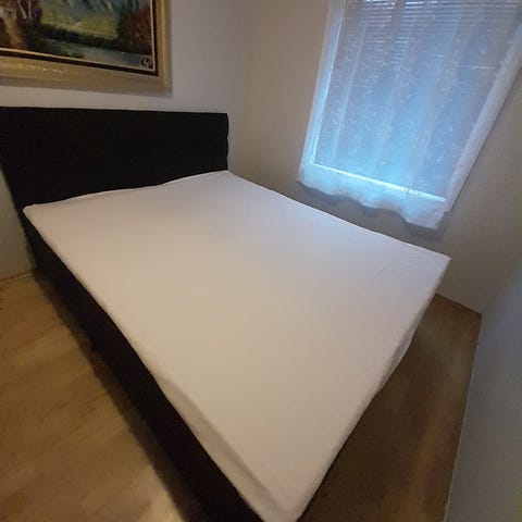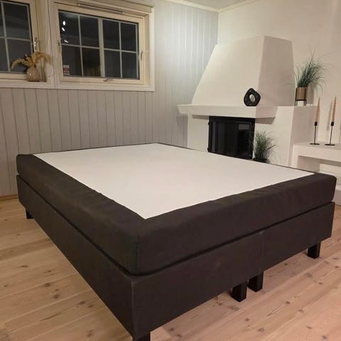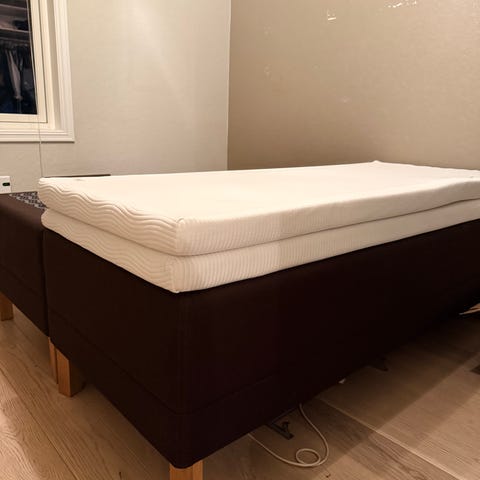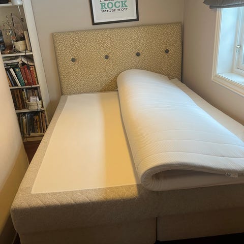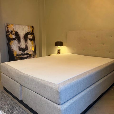 Sengen selges med bra Jensen overmadrass. Sengen er ren, uten flekker eller mangler. Den er i lys beige farge, som ser veldig luksuriøs ut i virkeligheten. Stoffet er i ull.