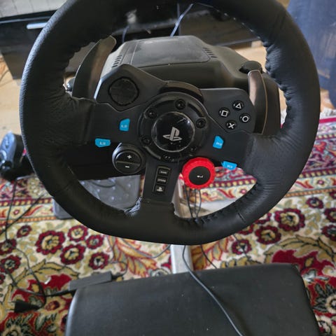 Logitech G racingutstyr bestående av ratt, pedalsett og girspak. Rattet har flere knapper og en sentral Logitech-logo. Pedalsettet inkluderer tre metallpedaler. Girspaken har en kuleformet girknapp. Utstyret er designet for bruk med sim-racing og spill.