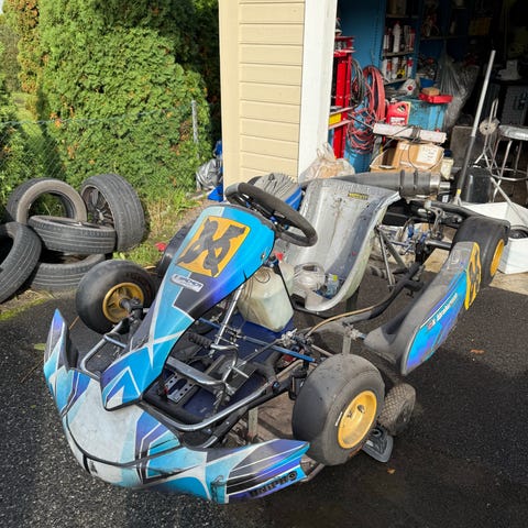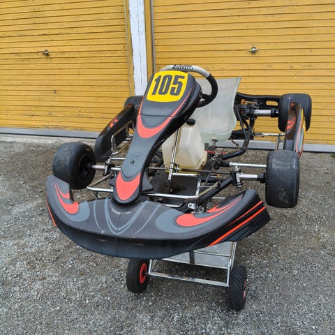Gokart Go-kart, Utstyrt med ratt, sete og drivstofftank. Passer for kjøring på bane eller fritidsbruk. Hel og god stand men har stått en stund, litt pussing så blir den bra, har fo mange prosjekter så denne selges, passer med 80/85cc motor og opp til 250cc, her er det mulighet til og lage gromt kjøretøy til den rette.