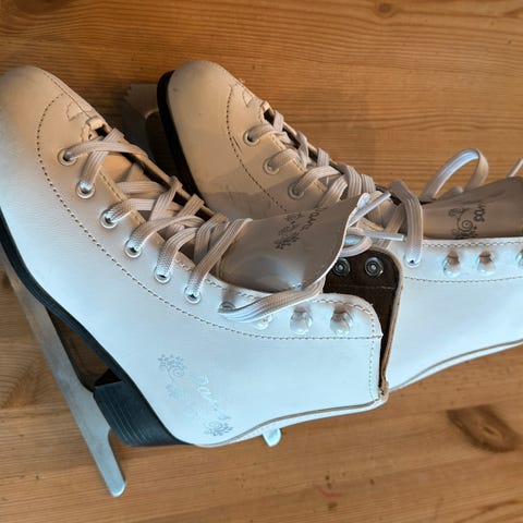 Jofa 414 ishockeyskøyter i størrelse 41. Skøytene er designet for ishockey og har tradisjonell snøring. Farge og materiale er svart med hvite detaljer.