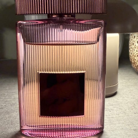 Prada Milano parfymeflaske med trekantet form og svart kork. Flasken inneholder en flytende parfyme med gylden farge. Designet for bruk som duft.