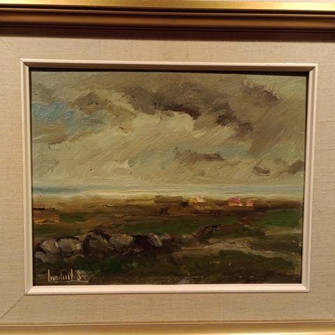 Maleri av et landskap, datert 1932. Målene på maleriet er 42x26 cm. Bildet viser en sti med trær og en bygning i bakgrunnen.
