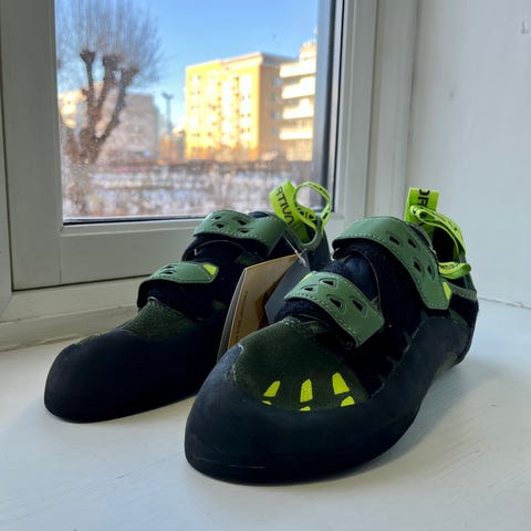 La Sportiva Tarantulace klatresko i størrelse 41,5. Modellen har et design tilpasset klatring, med farger i svart og kiwi. Helt ubrukte sko.